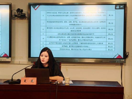 本次培訓特邀宣城市公共資源交易有限公司夏蓮擔任主講,全市各級各類學校、幼兒園及教體局相關直屬單位負責人、分管領導及具體經辦人員參加。本次培訓重點突出、實操性強、覆蓋面廣。培訓內容緊密圍繞當前學校招采工作的關鍵環(huán)節(jié)與突出風險點,進行系統(tǒng)梳理和精準剖析。